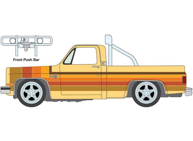 1/64 1981 Chevrolet Silverado Fleetside Lowered, Custom Cream with 5 Color Stripe Graphics