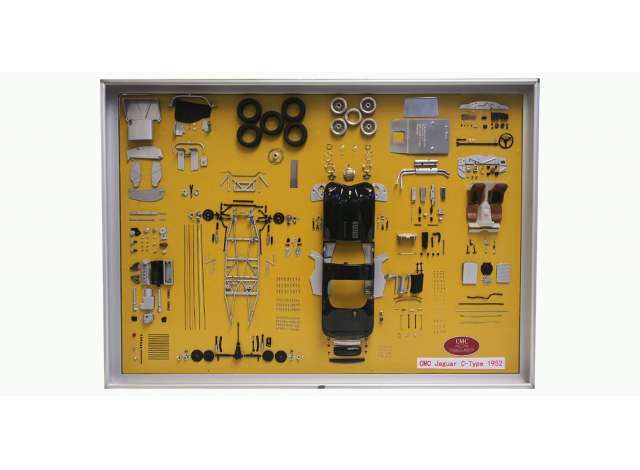 To hang the Jaguar C-Type on a wall should be something unthinkable and mind-boggling. But you can do it now in short, everything that CMC makes and uses to produce an authentic and intricately-detailed replica of your dream car. The parts ares beautifully arranged on a leather-covered board and neatly held in place with the support of an aluminum frame. The display board can go on the wall as a picture frame.