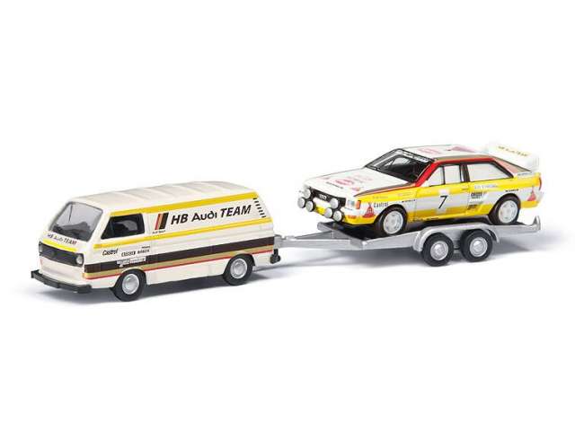 1/87 Volkswagen T3 *HB Audi Team* + trailer & Audi Quattro Rally #7, white/yellow